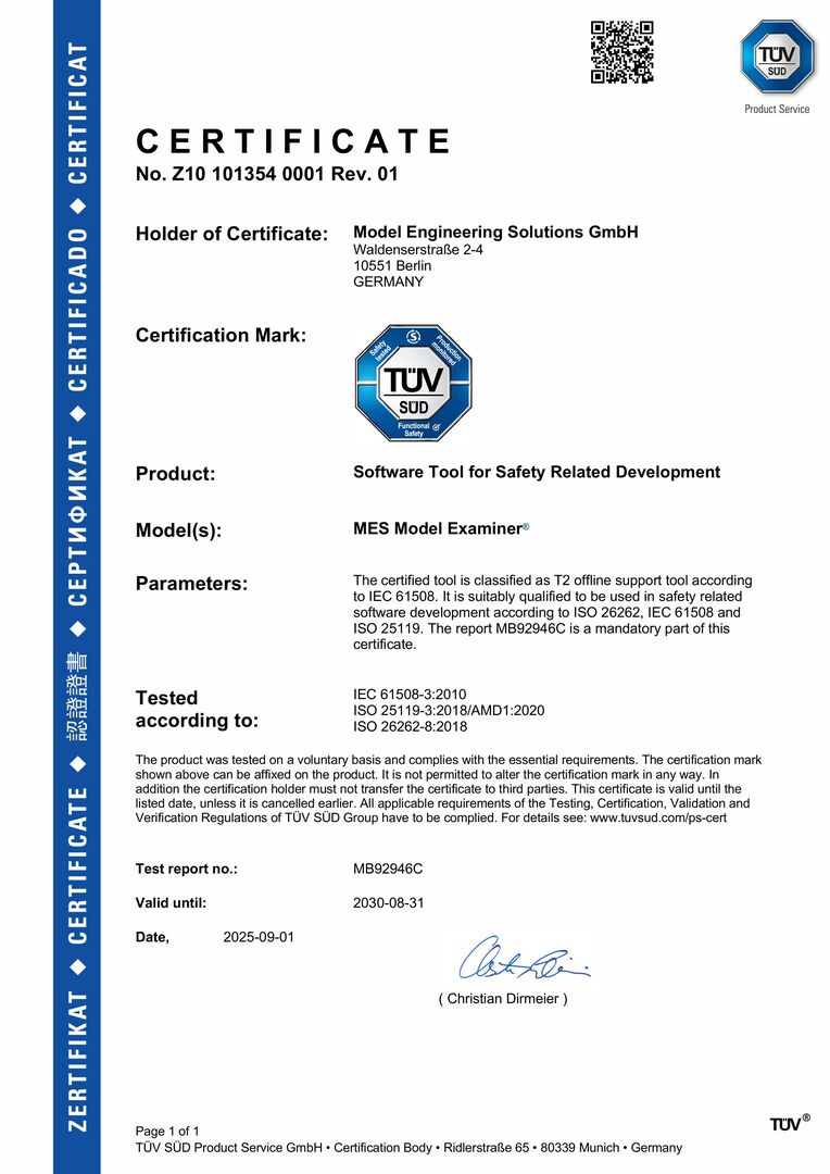 The Model Examiner is certified by TÜV SÜD as a T2 Offline Support Tool for use in safety-relevant embedded software development in compliance with ISO 26262, IEC 61508, and ISO 25119. It is designed for function developers, testers, and quality managers in model-based development on the MATLAB®/Simulink®, Embedded Coder®, and TargetLink® platforms.